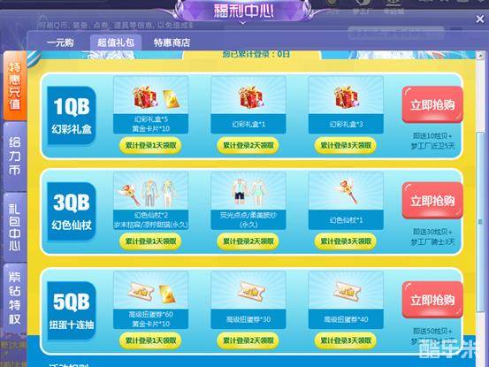 玩家可花费1QB购买幻彩礼盒道具,获赠10炫贝及梦工厂近卫5天。同时累计登录1天即可领取幻彩礼盒5个及黄金卡片10张,累计登录2天可领取幻彩礼盒1个,累计登录3天可领取幻彩礼盒3个,共计9个幻彩礼盒。