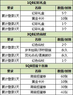 玩家花费5QB即可获得高级扭蛋券并获赠50炫贝及梦工厂骑士5天。同时累计登录1天即可领取高级扭蛋券60张及黄金卡片10张,累计登录2天可领取高级扭蛋券30张,累计登录3天可领取高级扭蛋券40张,总计130张高级扭蛋券。