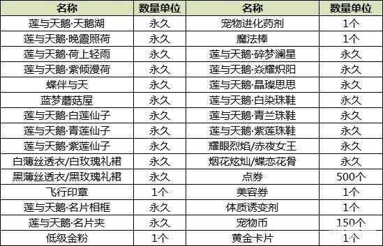 本期我们为大家准备了很多精美的礼品,其中包括全新系列莲与天鹅,唯美的天鹅坐骑莲与天鹅·天鹅湖,可爱的蓝梦蘑菇屋,特殊飞行动作的翅膀莲与天鹅·晚霞照荷、莲与天鹅·荷上轻雨、莲与天鹅·紫倾漫荷以及蝶伴与天,系列服饰莲与天鹅·白莲仙子、莲与天鹅·青莲仙子、莲与天鹅·紫莲仙子等其他热销道具,喜欢的玩家不要错过哦!