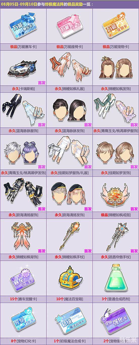 8月5日-9月10日期间,终极魔法阵暑期奖励再更新,一大波首发极品套装、永久T1机甲、永久A车、极品宠物等你来抢,千万不要错过哦!