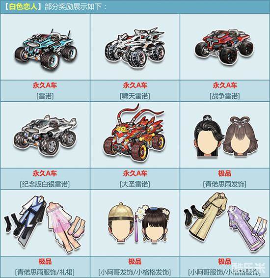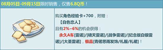 8月5日-9月15日,购买角色经验卡+700,附赠【白色恋人】,有机会得永久A车【雷诺】/【啸天雷诺】/【战争雷诺】/【纪念版白银雷诺】/【大圣雷诺】、极品【青偌思雨发饰/礼服/礼裙】或其他奖励之一!其中核心极品期限型概率范围为:4%-6%,核心奖励永久型概率范围为:2%-4%,非核心奖励概率范围为:90%-94%。
