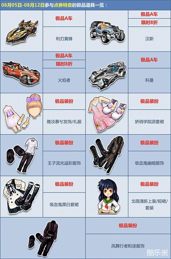 QQ飞车暑期盛典狂欢,大型点券特卖全面开启!8月5日-12日,极品A车【利刃黄蜂】/【火焰者】/【汉斯】/【科曼】最低8折出售,还有极品套装【清冽伊人套装】/【佐罗世袭礼服】等限时出售,手快有,手慢无哦!