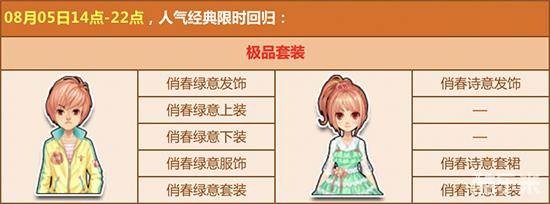 8月5日14点-22点,人气套装【俏春诗意/俏春绿意套装】限时回归,简单小清新的装扮洋溢着青春的气息,在燥热的夏季尽显清爽舒适,喜欢的玩家们记得别错过哦!
