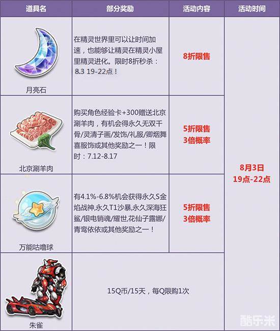 8月3日19点-22点,人气宝箱【北京涮羊肉】/【万能咕噜球】限时5折出售、3倍极品爆率,可产出永久【无双千骨/灵清子画系列服饰】、永久S【金焰战神】、永久T1【沙暴】。同一时间段,人气道具【月亮石】限时8折,极品T1机甲【朱雀】限时特价出售!