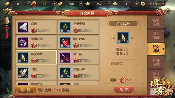 行会商城中的道具大概可分为三种,其一是材料类,比如说声望令牌、符文碎片、技能残章,其二则是功能类,比如说金币、穿云箭、治疗神水、飞鞋、消红药水和治疗药水,其三则是属性加成类,比如装备和坐骑皮肤。