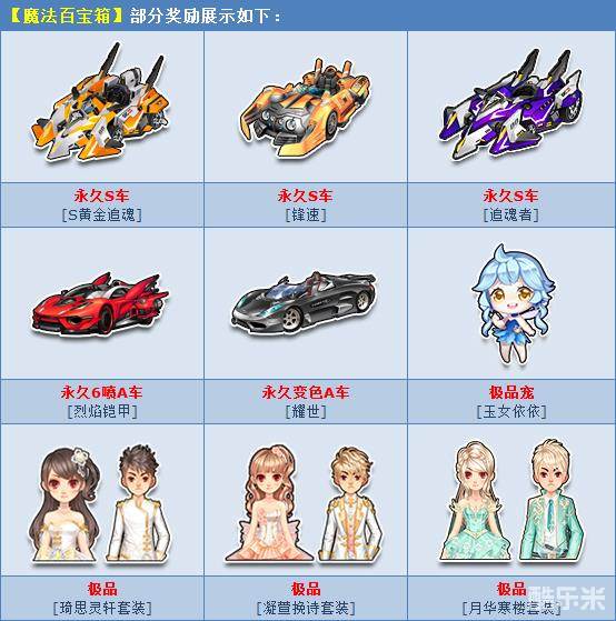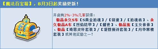 【魔法百宝箱】8月3日起奖励更新,开启有几率获得:极品永久S车【S黄金追魂】/【锋速】/【追魂者】、永久极品A车【烈焰铠甲】/【耀世】、极品宠【玉女依依】、极品【琦思灵轩套装】/【凝萱挽诗套装】/【月华寒楼套装】或其他奖励之一!获得核心奖励永久型概率是:2%-3%,获得核心奖励期限型概率是:3%-5%,获得非核心奖励概率是:92%-95%。