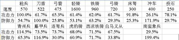 (1)对比各兵种对某一兵种的杀伤情况。枪兵打冲车为1.75,弓骑打冲车为0.18,接近10倍的差距。也就是说,单论对冲车的输出而言,枪兵是弓骑的10倍,在相同的攻防下,如果枪兵可以3次打死冲车,那么弓骑需要30次。
