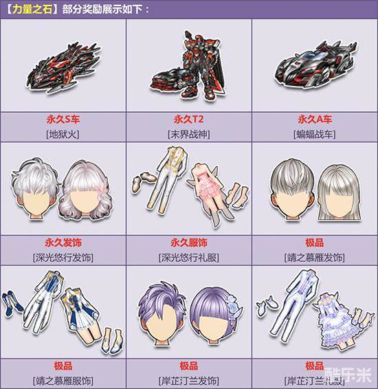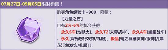 7月27日-9月5日,购买角色经验卡+900,附赠【力量之石】,有机会得永久S车【地狱火】、永久T2【末界战神】、永久A车【蝙蝠战车】、永久【深光悠行发饰/礼服】、极品【靖之慕雁发饰/服饰】/【岸芷汀兰发饰/礼服】或其他奖励之一!其中核心极品期限型概率范围为:4%-6%,核心奖励永久型概率范围为:2%-4%,非核心奖励概率范围为:90%-94%。