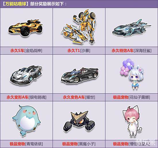7月27日起,2Q币购买【万能咕噜球】,有机会得永久S【金焰战神】、永久T1【沙暴】、永久A车【深海狂鲨】/【银电销魂】/【耀世】、极品宠物【花仙子露娜】/【青鸾依依】/【黑魔小子】/【懵懂喵星人】或其他奖励之一!其中核心极品期限型概率范围为:5%-7%,核心奖励永久型概率范围为:3%-4%,非核心奖励概率范围为:88%-92%。