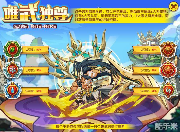 点击各系徽章头像,可以开启挑战,帮助武王挑战6大系宠物,获得6大系认可,证明圣尊武王的实力,6大系认可度全满,可以获得圣尊武王的进阶资格。