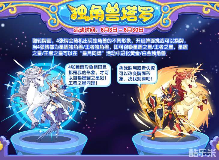 翻转牌面,4张牌会随机出现独角兽的不同形象,开启牌面挑战可以换牌,当4张牌都为星耀独角兽/王者独角兽,即可召唤星耀之星/王者之星,星耀之星/王者之星可以在“星月同辉”活动中进化黄金/白金独角兽