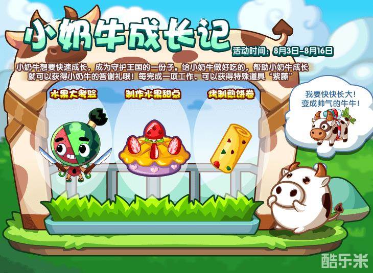 小奶牛想要快速成长,成为守护王国的一份子。给小奶牛做好吃的,帮助小奶牛成长就可以获得小奶牛的答谢礼哦!每完成一项工作,可以获得特殊道具“紫藤”