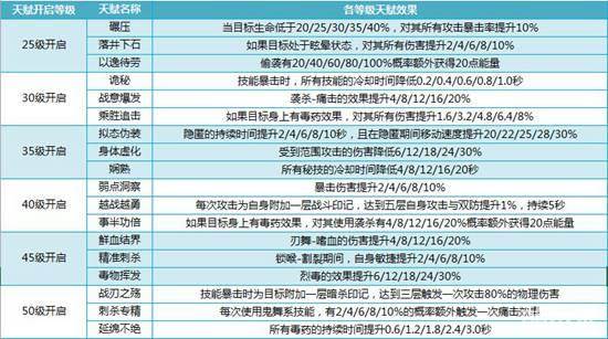 以袭杀-影随、隐匿-鬼影、横切-弱点技能为核心,搭配天赋拟态伪装、诡秘、弱点洞察、战刃之殇,主要思路是使用技能袭杀-影随重置隐匿-鬼影的CD,多次使用隐匿-鬼影技能来增加自身机动性,是敌人很难持续攻击自己,利用天赋拟态伪装提高隐匿状态的持续时间和移动速度。使用技能隐匿-鬼影、横切-弱点提高暴击率,利用天赋诡秘、弱点东擦、战刃之殇可以提高暴击收益。走位较好可以使用,大部分使用情况在PVE下,暗杀天赋搭配:碾压、诡秘、拟态伪装、弱点洞察、鲜血结界、战刃之殇各5点。