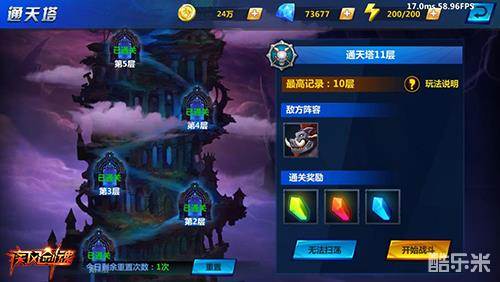 首次进入通天塔需要从1层开始,点击【开始战斗】后进入战斗场景,每层挑战时间为60秒,需要在挑战时间内消灭守关BOSS后方可进入下一层。