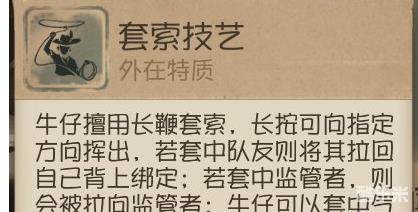 物品效果:牛仔使用套索可以将目标套住,如果套住的是队友,那么可以将队友拉到自己背上,如果套住的是监管者,那么就会把自己拉向监管者。同时不管是狂欢之椅上的队友还是被绑在气球上的队友都可以用套索去救。