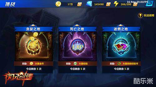 进入挑战系统以后,一共有3种挑战供你选择, 其中:挑战贪婪之地的人能获得大量金币;挑战死亡之地的人能获得大量角色经验;挑战迷惘之地的人能获得大量技能经验书~如果你拥有足够的实力和勇气,且希望能大幅度提升自己的实力,就快来参加挑战吧~