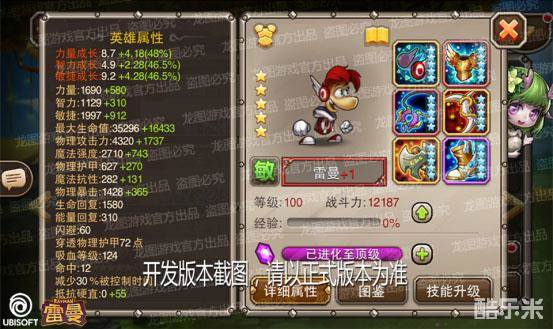 作为前排物理系英雄,力量和敏捷属性卓越,物理攻击力和物理暴击在同类英雄中相当出众,穿透物理护甲属性让他的输出更上一层楼。优秀的生命回复和吸血能力使他在战场上更持久地翻江倒海。配合高闪避和减控属性的支持,雷曼在场上更加来去自如,活蹦乱跳的他既能帮助队友缩短控制效果持续时间,又能在敌人阵中拳打脚踢,施放各种控制技能,不停地骚扰敌方的进攻节奏。雷曼灵巧的身影即将遍布传奇大陆的各个角落。