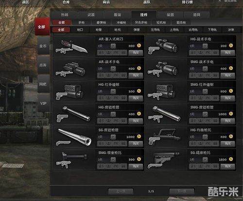 挂件分类主要按照其挂装于武器上的位置,具体为枪口、弹匣、枪托、左导轨、右导轨、下导轨、上导轨、枪管、涂装共计九个。