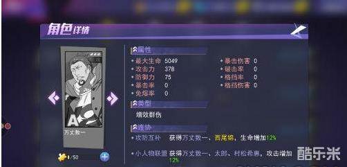 万丈数一的所有主动技能都是范围伤害,并且二技能还能够给自身提升攻击力,所以在输出伤害的表现上还是不错的。连协方面能够和一开始获得的西尾锦产生连协,并且其余两条也并不是很难,所以整体上感觉万丈数一还是一个比较不错的角色。但是需要注意的是万丈数一只是一个A级角色,也就是说在前期如果获得早的话,可能有机会一用,如果说是游戏中后期获得的话,那么就没必要使用了,因为任何一个A+级或者S级的角色都要比万丈数一要好点,所以大家一定要注意,角色的品质还是优先选择的条件。