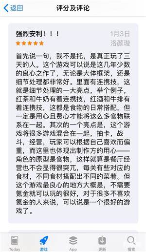 而想了解一款手游好不好,看用户评分及评论则是最直观的判断方式。首先,4.8的高分在同类型手游中排名超前,可以说是非常理想的成绩。再细看数万条评论中,满星评价比比皆是,更有不少长篇精品评价。玩家愿意花功夫花时间做评价,不难看出他们是真正发自肺腑的喜爱这款手游。那么,《食之契约》究竟为何能得到玩家一致的喜爱呢?