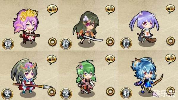 所有武将都拥有「斩」「打」「突」「投」「射」「弹」的其中一种武器类型,武将只能装备与自己同类型的武器,每个武器类型在射程距离及数值上都有其特色