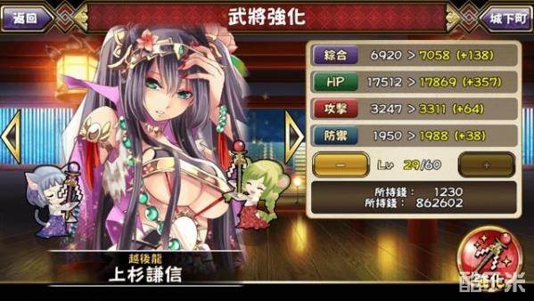 藉由强化能提升武将的等级,武将等级提升后,综合‧HP‧攻击‧防御力都会上升,但是武将等级无法超越城主等级