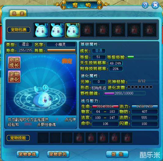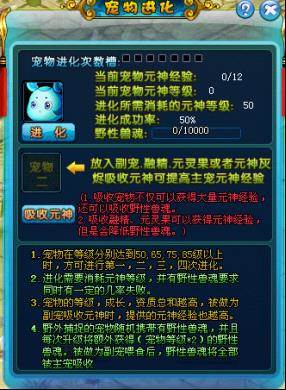 等级:当宠物等级达到50级时,可以进行进化操作,进化后的宠物将拥有更华丽的外形以及更为出色的属性。