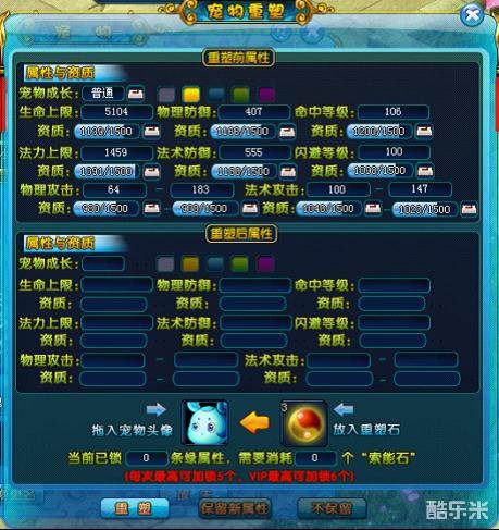 点击打开宠物重塑界面,在这里可以进行宠物的重塑操作,假如你对生命上限资质已经很满意,那么你可以通过点击它旁边的小锁图标