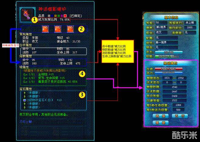 另外,《聊斋》装备具有威力概念,白字属性|烙嵌属性|宝石属性受到威力的影响,而绿色属性不受威力概念的影响,具体参看如下示意图: