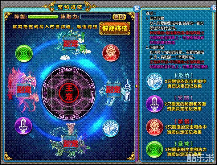 宠物结阵,需要一只主宠和至少一只副宠(最多可四只)。结阵将极大的提升主宠物的属性,并获得一些特殊的能力。