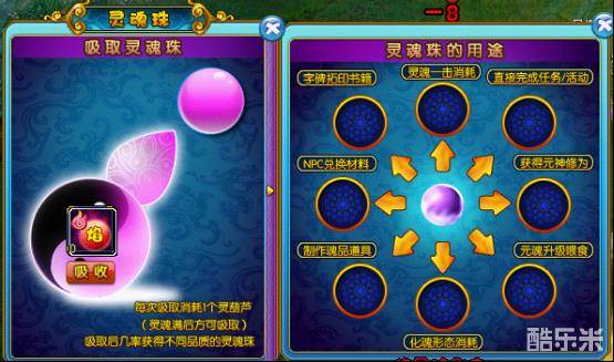 吸取灵魂珠。指玩家在修炼、升级过程中获得了大量的灵魂值,灵魂值储存满后进行吸收获得不同品质的灵魂珠。