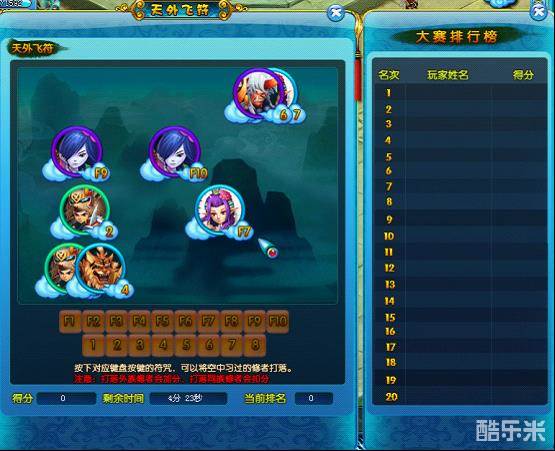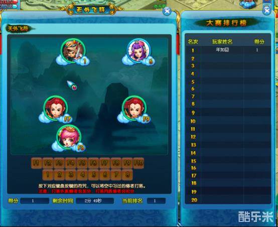 3.准备时间倒计时为0时活动开始,游戏区会有修者飞过,玩家可以通过按下修者身上标识的对应键盘按键释放飞符、击落修者。击落与自己种族相同的修者减分,反之加分。5分钟游戏后结束。