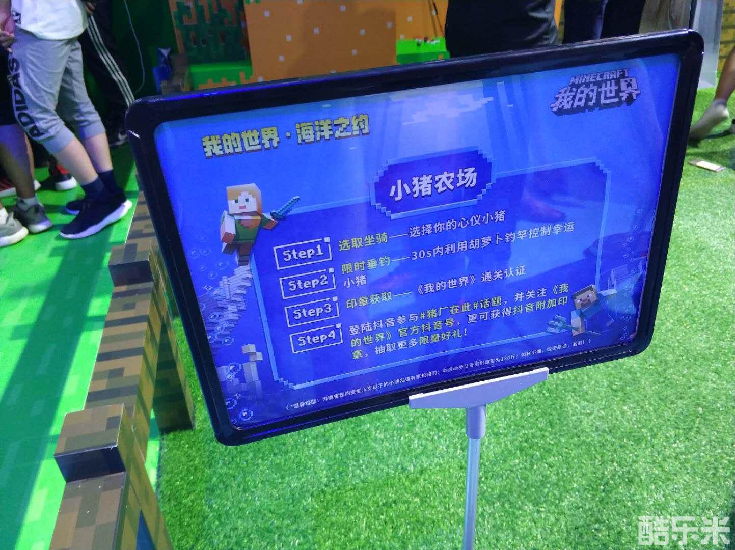《我的世界》展区最引人瞩目的活动是一个非常有“猪厂”特色的骑猪活动。玩家可以在一排MC风格的小猪中选择自己心仪的那头,骑上并把控好一根悬挂有吸铁石的细长钓竿,从一堆小猪中钓出会为你带来“通关认证”的幸运小猪。