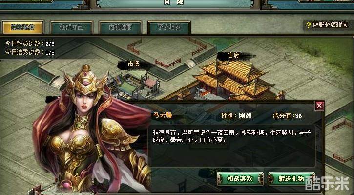 通过“官府”中的【红颜知己】按钮,玩家可以进行“微服私访”和“宫廷选秀”来偶遇佳人,民房、客栈、市场、书院、校场……佳人最易出现的地方是哪里呢?另外,不同的建筑,有不同的优先性格哦~你想遇到一个温柔美人还是个睿智女诸葛呢?
