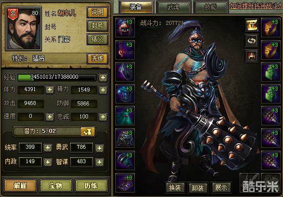 很显然,为了斗将考虑的话,每件装备的宝石用勇武和攻击是战斗力最大化的选择,至于精力,其实精力对于技能伤害是有影响的,但是对实际战斗力到底有多大影响没法计算,从经验来看,一般的斗将一身紫装情况下,至少要蓝色以上的“青虹贯日”才会超过普通攻击的伤害,而经过测试,用智谋的宝珠代替攻击,实际上对技能的强化效果很一般。当时是用的蓝色技能测试的,因为没有更高品质的技能了,所以精力的影响无法进一步测试了,但值得一提的是,如果身上有六件以上橙色装备的话,那就可以放心使用技能了,绿色的也可以有超过普通攻击的伤害。