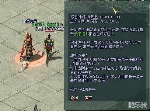 4、积分说明:势力首领在天坛祭祀5秒得到1点当前积分,离开天坛则当前积分清零;