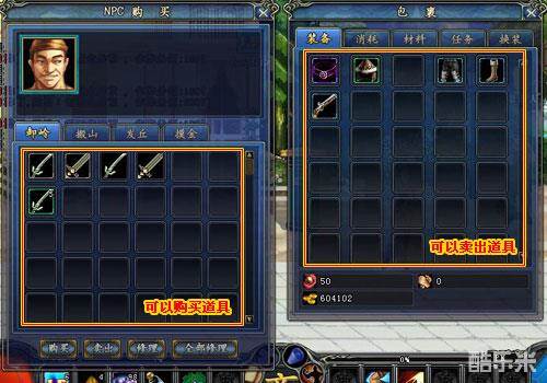 二、 鼠标左键与NPC选择交易之后,便打开了买卖的界面,可以买进或卖出道具。