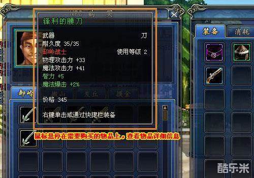 1、物品购买完成后,请先关闭买卖界面后,再打开包裹界面用右键装备或者使用你所需要使用的道具。