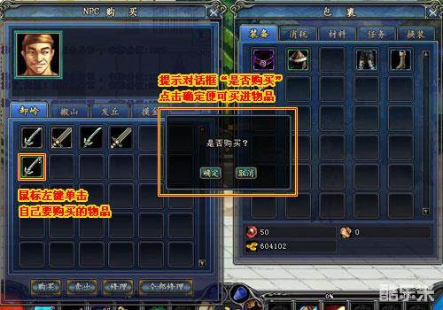 四、鼠标左键单击自己要购买的物品,会出现提示对话框“是否购买”点击确定便可买进物品;或是左键点选需要卖出的物品后拖曳至购买界面,便可以卖出物品。