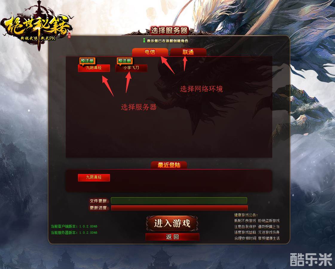 1.玩家进入游戏,选择自己的网络环境,然后选择服务器