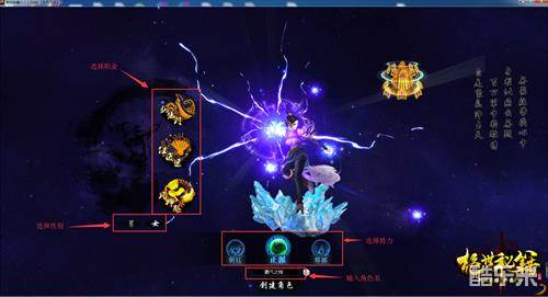 2.新进入玩家开始创建角色,下图上标示了选择势力、职业、性别,选择好后填写自己喜欢的角色名,点击下方创建角色即可。