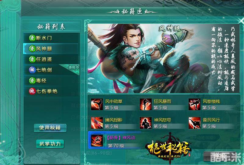 初始创建角色时,玩家可以在三种初始秘籍中选择一个(可选的三个秘籍为刀类的断水门,扇类的任逍遥,手类的风神腿)。