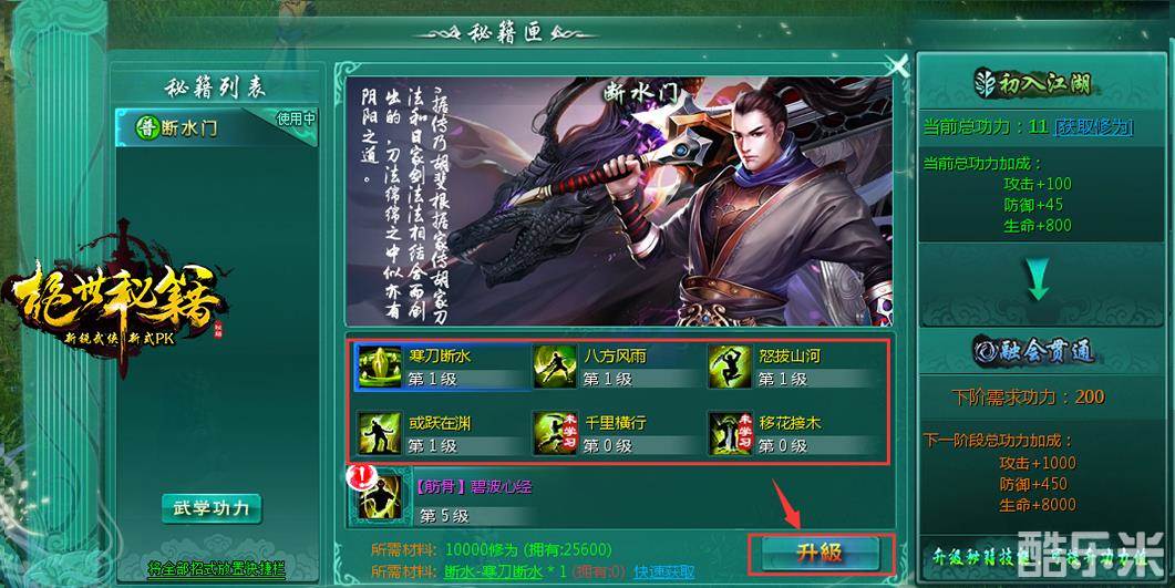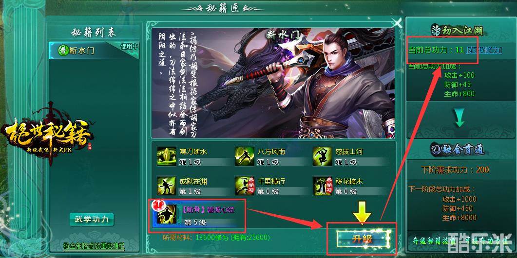 每个秘籍都由筋骨和招式组成,修炼筋骨可以增加秘籍武学功力,升级招式可以提高技能效果及武学功力。