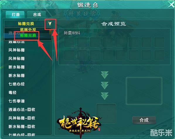 玩家可以在主城锻造大师处(51,46)兑换秘籍。选择打造,点击选择打造,选择秘籍兑换,选择想要合成的秘籍,再点右下角合成,即可完成兑换秘籍。