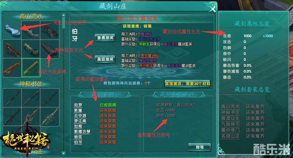 晓天下之兵器,藏剑于山庄而名震江湖!收集各式各样之神兵利器,以此彰显武学资历和地位,是少侠江湖历练成一代宗师的漫漫之路。新版本现隆重推出藏剑系 统。此系统作用和秘籍图鉴系统类似,收集方法有所不同。集齐全套武器即可激活武器套装,增加各种战斗属性,还可获得相应的套装称号。