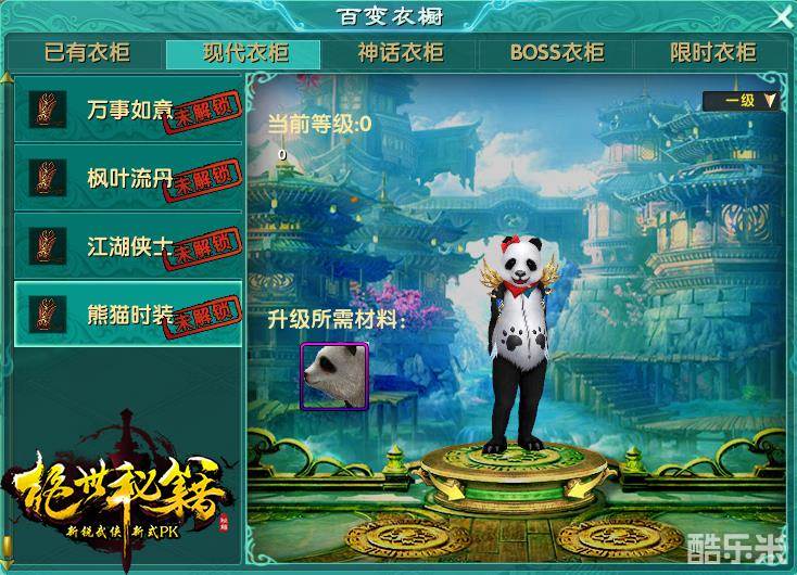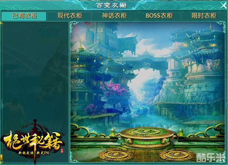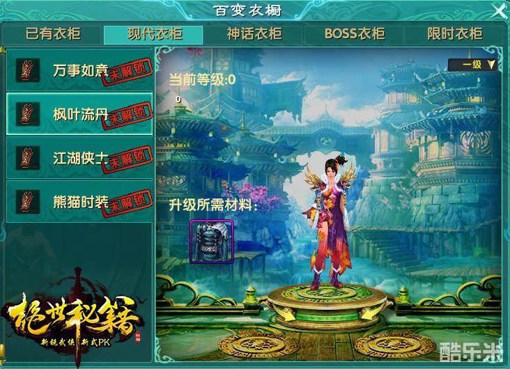 《绝世秘籍》的百变衣橱给玩家提供了四种衣柜,分别是现代衣柜,神话衣柜,BOSS衣柜,限时衣柜。玩家们收集的时装都会在这些衣柜中一一展出,华彩夺目。