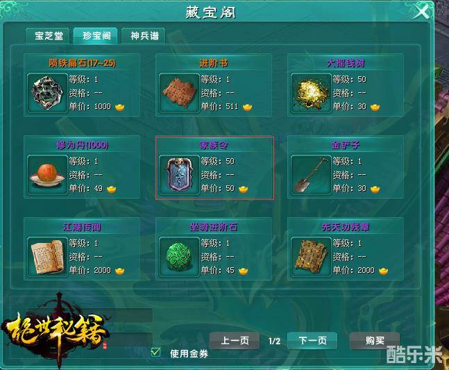玩家一到50级就可以创建家族了,创建家族需要家族令。点击右下角的商店菜单,在弹出的藏宝阁中选珍宝阁即可看到家族令,点击购买。