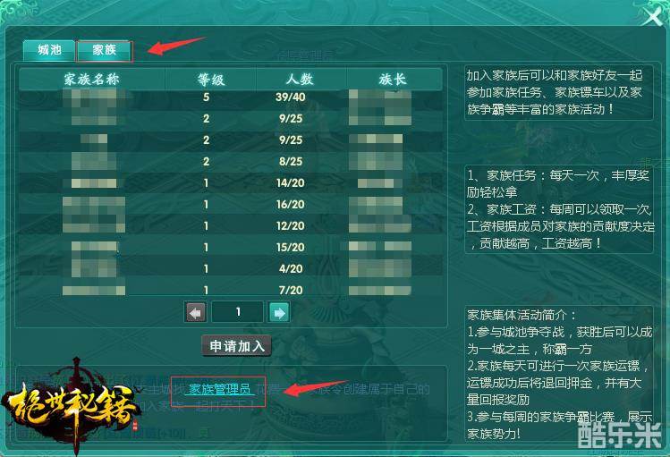 《绝世秘籍》的家族系统共5级,每升一级人数上限加5人,初始值20人,最高等级只有40人,有别于其他游戏,每位族员都是家族不可或缺的一员,得到家族的厚待与援助,还等什么,快来创建加入吧!