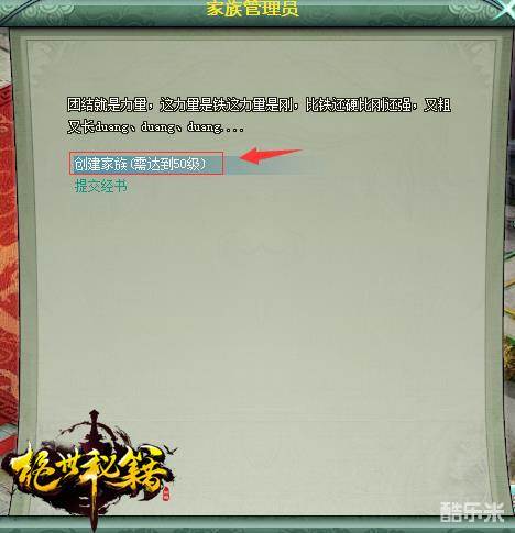 点击确定,家族创建成功,少侠可以招兵买马,安身立命,纵横江湖了。