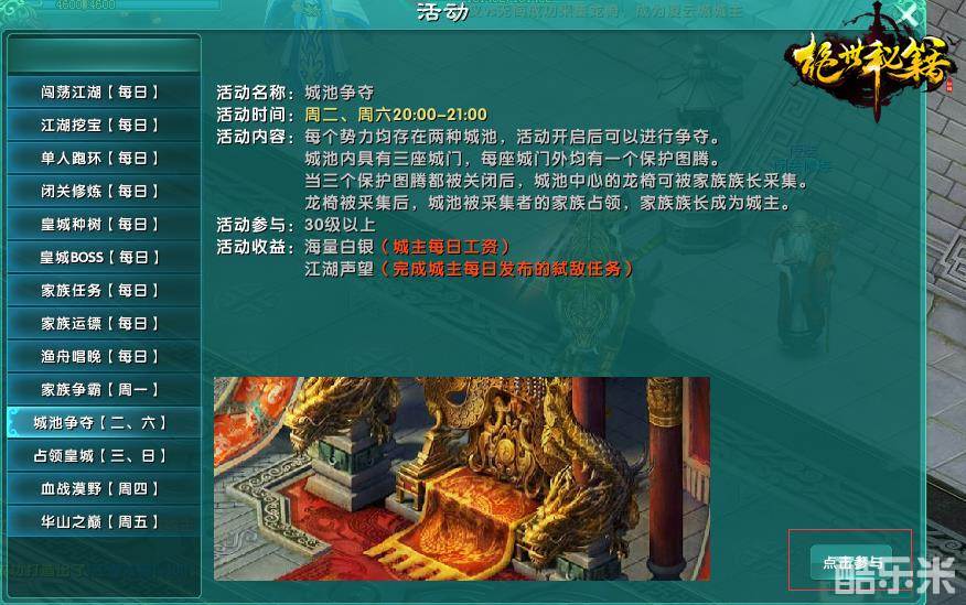 每周二、六20:00前,点击玩法——活动——城池争夺,查看活动,点击参与可自动寻路。